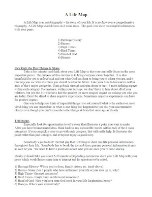 A Life Map is an autobiography – the story of your life. It is not, however, a comprehensive biography. A Life Map should focus on 6 main areas. The goal is to share meaningful information with your peers.